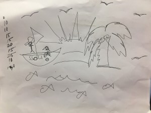 Everyone needs a pen and a paper. Place a blank sheet of paper in front of you, in the landscape direction. We are all going on a vacation. Close your eyes keep them closed and I will tell you when it is okay to open them. We are going on a vacation to a tropical island, so draw an island in the middle of your paper.